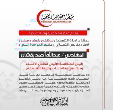 تتقدم منظمة حضرموت الصحية، ممثلةً بـ الإدارة التنفيذية وموظفي وأعضاء مجلس الأمناء، بخالص التعازي وعظيم المواساة إلى